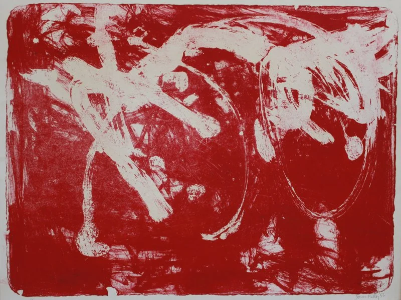 Kelly’s enlistment in the Air Force during World War II granted him the GI Bill and a ticket to San Francisco. It was there that his lithographic pieces received much attention, including that of Charles Dean, whose extensive Abstract Expressionist collection was acquired by the Library of Congress.
