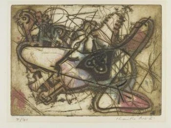 Julius Wasserstein, painter, printmaker and teacher, was born to Dora and Morris Wasserstein on 17 May 1924 in Providence, Rhode Island and his family moved to San Francisco the following year. During World War II, Wasserstein enlisted into the Army in 1943 and was discharged in 1946. With his G.I. Bill benefits, Wasserstein attended the California School of Fine Arts [later the San Francisco Art Institute] between 1950 and 1953 studying with David Park and Elmer Bischoff. In 1952, he attended painting seminars given by Hassel Smith and he experimented with printmaking, both intaglio and lithography, in James Budd Dixon’s classes. Wasserstein began working at the San Francisco Museum of Modern Art in 1952 as a preparator, a position he held for thirty-three years. The California School of Fine Arts offered a new degree program in 1953 and Wasserstein was among the first graduates. He was included in group shows at the King Ubu Gallery in San Francisco and had his first solo exhibition there in 1954. That same year, Wasserstein had a solo show at the Lucien Labaudt Gallery, and, in 1956, his solo exhibition was featured at the Six Gallery in San Francisco. Between 1955 and 1958, he continued his studies at the San Francisco State College. Wasserstein taught at the San Francisco Art Institute from 1960 to 1963 and, in 1961, he received the San Francisco Arts Association’s $1,000.00 Nellie Sullivan Award, given to a talented, promising artist in California. His work was included in group exhibitions at the San Francisco Art Association, the San Francisco Museum of Art, the Whitney Museum of American Art, the California Palace of the Legion of Honor, and the Santa Barbara Museum of Art. On Wasserstein’s paintings, John Coplans wrote: He is an action painter “par excellence,” who demonstrates his enormous control over his technique like a superb athlete. Beautiful velvet black brush strokes, luscious clots of paints, spontaneous scribbles dug into the paint surface, elegant flourishes, deadly slashes: all demonstrate that he has learned his lessons well. Julius Wasserstein’s work is represented in the collections of the Nora Eccles Harrison Museum of Art, Utah State University, Logan; the Victoria and Albert Museum, London; the Fine Arts Museums of San Francisco, California; and the Worcester Art Museum, Massachusetts.