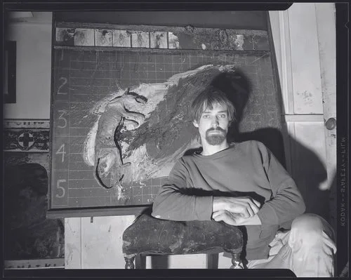 Llyn Foulkes is a contemporary American artist and musician known for his collages, heavily textured paintings, and solo performances using a self-made musical instrument he calls “The Machine.” Inspired by his own disillusionment with American consumerism and the American West, Foulkes often employs relics of nostalgia and hope, including postcards of tourist landmarks, bald eagle insignia, images of Mickey Mouse, and self-portraits. “Oh, that’s cute. It’s like a joke,” he once decried of Andy Warhol’s artwork. “That’s all I could think of it. I’m looking at the paintings and, well, anybody could have done them. And yet, I knew that one of my huge paintings which had recently been on display and took seven years to complete would sell for far less than one of his soup cans.” Born on November 17, 1934 in Yakima, WA, he studied both music and art at the Central Washington College of Education before being drafted in the Army in 1954. In 1957, Foulkes moved to Los Angeles where he attended the Chouinard Art Institute and began exhibiting alongside Ken Price and Ed Ruscha at the famed Ferus Gallery. Largely absent from the art world since the 1980s, in 2013, Foulkes was the subject of major retrospective at the Hammer Museum in Los Angeles as well as the documentary film Llyn Foulkes One Man Band, directed by Tamar Halpern and Chris Quilty. He continues to live and works in Los Angeles, CA. Today, the artist’s works are held in the collections of The Museum of Modern Art in New York, the Hirshhorn Museum and Sculpture Garden in Washington, D.C., the Centre Georges Pompidou in Paris, and the Los Angeles County Museum of Art, among others.
